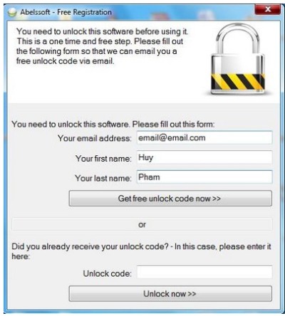 Sau khi tải xuống và cài đặt, trong lần đầu tiên sử dụng, một hộp thoại sẽ xuất hiện yêu cầu bạn đăng ký bản quyền. Tại hộp thoại này, bạn cần điền địa chỉ email, tên và họ, sau đó nhấn vào nút Get free unlock code now.