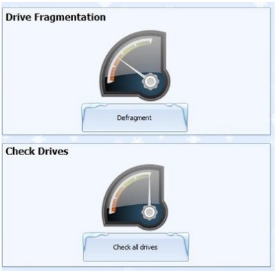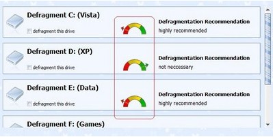 - : Chống phân mảnh bộ nhớ, giúp tối ưu và tăng tốc độ truy xuất bộ nhớ nhanh chóng và hiệu quả hơn. Tuy nhiên, tính năng này không được cung cấp trong phiên bản Professional mà bạn cần nâng cấp lên phiên bản Ultimate. Khi nhấn vào nút Defragment tại mục Drive Fragmentation, phần mềm sẽ yêu cầu bạn chọn phân vùng ổ cứng muốn chống phân mảnh. Bên cạnh mỗi phân vùng, sẽ hiển thị một biểu tượng đồng hồ. Với những phân vùng có kim đồng hồ chỉ vào màu đỏ, đó là phân vùng bạn nên tiến hành chống phân mảnh. Ngược lại, nếu chỉ vào màu xanh, phân vùng đó đang hoạt động ổn định và không cần thực hiện thêm.