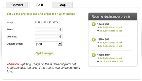 Để chia ảnh thành nhiều mảnh nhỏ, phục vụ cho việc in ấn và ghép lại thành một bức ảnh lớn hơn, hãy chọn thẻ Split. Nhập số hàng vào ô Rows và số cột vào ô Columns. Bạn cũng có thể tham khảo các giá trị được đề xuất ở bảng bên phải.
