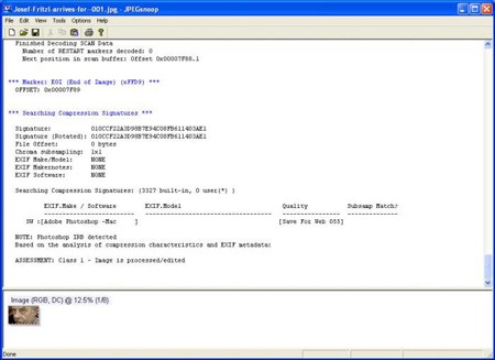 Để chứng minh hiệu quả, một thử nghiệm đã được thực hiện trên hai file ảnh: một ảnh đã được chỉnh sửa bằng Paint và một ảnh gốc từ máy ảnh. Kết quả cho thấy, JPEGsnoop có thể nhận diện các ứng dụng đã xử lý hoặc chỉnh sửa ảnh.
