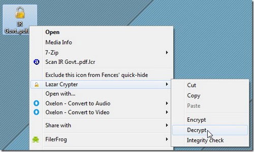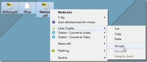 Sau khi cài đặt, việc mã hóa tập tin trở nên vô cùng đơn giản. Người dùng chỉ cần nhấp chuột phải vào tập tin mong muốn trong menu Lazar Crypter và chọn Encrypt.