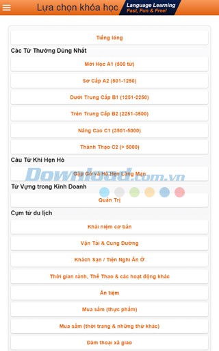 Ứng dụng Learn English Words Free cung cấp một loạt các khóa học đa dạng, bao gồm các cụm từ thường dùng trong du lịch, từ vựng tiếng Anh phổ biến, tiếng lóng hiện đại, tiếng Anh chuyên ngành Thương mại, và thậm chí là những lời tán tỉnh hữu ích.