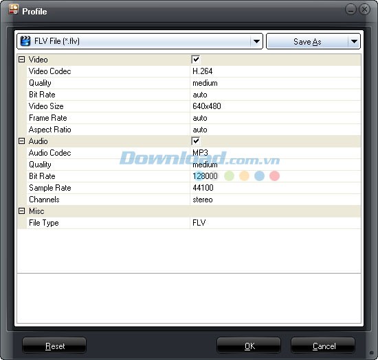 Các thông số liên quan đến video và âm thanh, bao gồm codec, tốc độ bit, kích thước video, tỷ lệ khung hình, tốc độ khung hình, số kênh, v.v., đều có thể được tùy chỉnh. Nhấn nút "" để mở các tùy chọn chỉnh sửa và "" để lưu các thiết lập tùy chỉnh của bạn dưới dạng cấu hình video đầu ra để sử dụng trong tương lai.