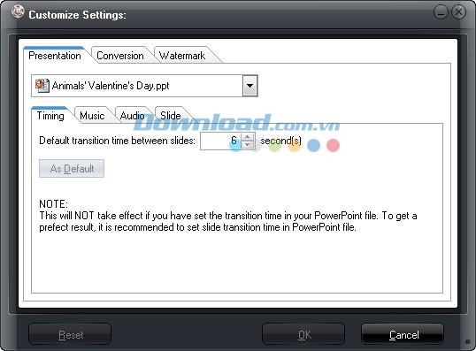 Timing: Điều chỉnh thời gian chuyển tiếp giữa các slide, với khoảng thời gian từ 0 đến 100 giây.