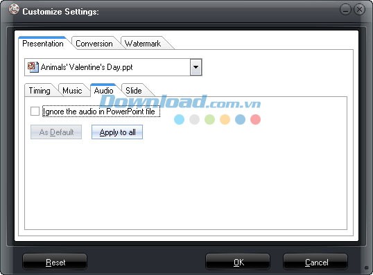 Audio: Chọn giữa việc thêm âm thanh từ trình chiếu PowerPoint hiện tại hoặc từ tất cả các tập tin PPT đã chọn.