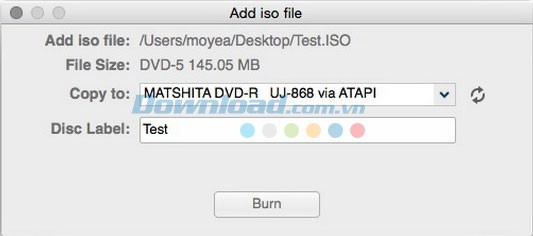 Ngay sau khi file ISO được thêm vào, một cửa sổ "Add iso file" sẽ mở ra. Tại đây, bạn cần thực hiện thiết lập cho hai tùy chọn quan trọng là "Copy to" và "Disc Label".
