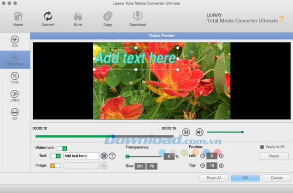 Chọn nút Watermark để thêm hình mờ, có thể là văn bản hoặc hình ảnh. Các thông số của watermark như phông chữ, kích thước, màu sắc, nội dung, độ trong suốt và vị trí có thể được tùy chỉnh theo ý muốn.