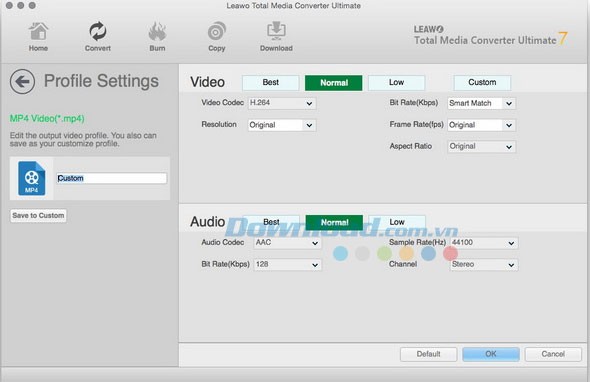 Bạn có thể tùy chỉnh các thông số video và audio đầu ra, bao gồm: video codec, độ phân giải, tốc độ bit, tốc độ khung hình, tỷ lệ video, audio codec, kênh, v.v.