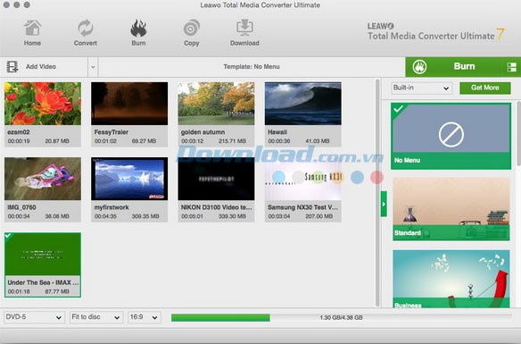 Chọn một mẫu menu đĩa thích hợp cho đĩa Blu-ray/DVD của bạn từ thanh công cụ bên phải. Bạn có thể nhấp vào giữa các menu để xem trước giao diện. Trong trường hợp không muốn sử dụng menu, hãy chọn tùy chọn “No Menu” ở thanh công cụ bên phải.