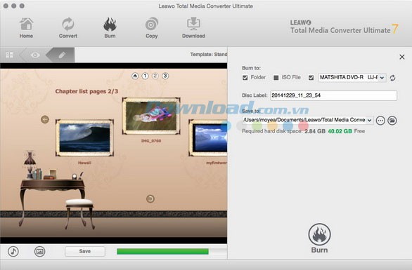 Sau khi đã lưu lại thiết kế menu đĩa, nhấn nút Burn màu xanh lam để tiếp tục. Bạn cũng có thể điều chỉnh thêm các thông số như: Burn to (ổ đĩa ghi), Disc Label (tên đĩa) và Save to (thư mục lưu). Để ghi video lên đĩa Blu-ray/DVD, hãy đảm bảo đã chèn đĩa trắng vào ổ đĩa tương ứng, sau đó chọn ổ đĩa trong mục Burn to.