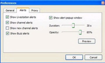 Ngoài ra, bạn có thể thiết lập để chương trình thông báo cho bạn về những diễn biến mới từ các kênh đã chọn, chẳng hạn như tin tức mới hoặc các chương trình cập nhật. Để thiết lập thời gian thông báo, hãy chọn tab "Alert" trong cửa sổ "Preferences" và điều chỉnh thời gian bằng thanh trượt ở mục "Durations". Thời gian mặc định là 30 giây.