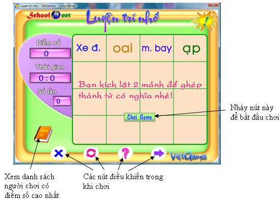 Trên màn hình sẽ xuất hiện 16 mảnh ghép hình chữ nhật. Dưới mỗi mảnh ghép là một âm vần, một từ hoàn chỉnh hoặc một từ còn thiếu.