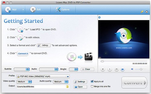 Để chuyển đổi phim DVD sang định dạng MP4 tương thích với thiết bị PSP và PS3, Leawo Mac DVD to PSP Converter nổi bật là một lựa chọn hàng đầu. Phần mềm này cung cấp các cấu hình cài đặt sẵn được tối ưu hóa, giúp quá trình chuyển đổi DVD sang PSP trở nên đơn giản và nhanh chóng.