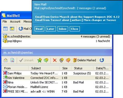 Mailbell sở hữu khả năng kiểm tra thư trực tiếp trên máy chủ của các nhà cung cấp dịch vụ thư điện tử, tương thích với các giao thức POP3, IMAP, IMAP-SSL, MAPI và Hotmail.