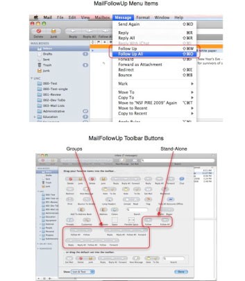 MailFollowUp Mail Plugin tích hợp một chức năng "Follow Up" trực tiếp vào giao diện của ứng dụng Mail mặc định trên Apple macOS. Chức năng này được thêm vào menu ngữ cảnh và thanh công cụ tin nhắn (tùy chọn), giúp người dùng dễ dàng soạn thảo và gửi một phiên bản đã được trích xuất từ email gốc đến tất cả những người nhận ban đầu.