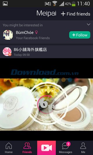 - Meipai sẽ tự động tìm kiếm bạn bè trên Facebook đang sử dụng ứng dụng này. Bạn có thể theo dõi họ bằng cách nhấn vào nút "Follow".