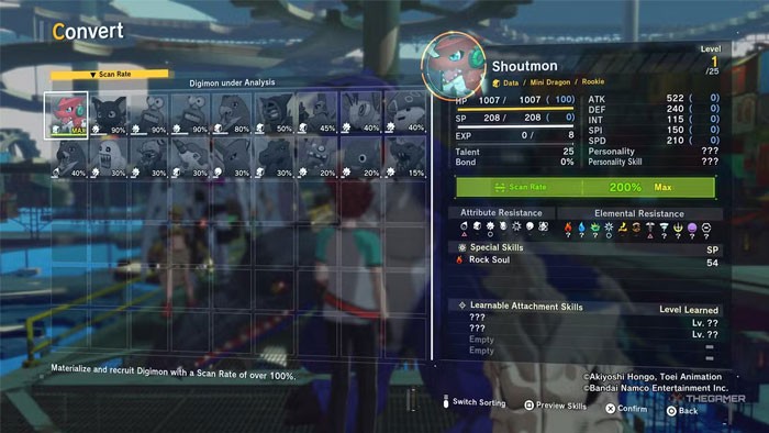 Khi Scan Rate đạt 100%, game thủ có thể Convert Digimon từ dữ liệu thành quái vật thực tế và bổ sung vào đội hình. Tuy nhiên, người chơi có thể tích lũy Scan Rate lên đến 200%, và khi Convert, Digimon sẽ được cộng thêm chỉ số. Do đó, lời khuyên là hãy kiên nhẫn chờ đợi trước khi thực hiện Convert, bởi những chỉ số cộng thêm này sẽ đóng vai trò quan trọng trong quá trình Digivolution sau này.