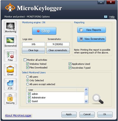 Micro Keylogger vận hành một cách âm thầm trong nền, liên tục giám sát máy tính. Ứng dụng này cho phép bạn theo dõi một cách kín đáo mọi thao tác của người dùng trên máy tính. Bạn có thể nắm bắt được những hoạt động của con cái hoặc đồng nghiệp, đồng thời tạo một bản sao lưu dữ liệu nhập liệu bằng Micro keylogger.