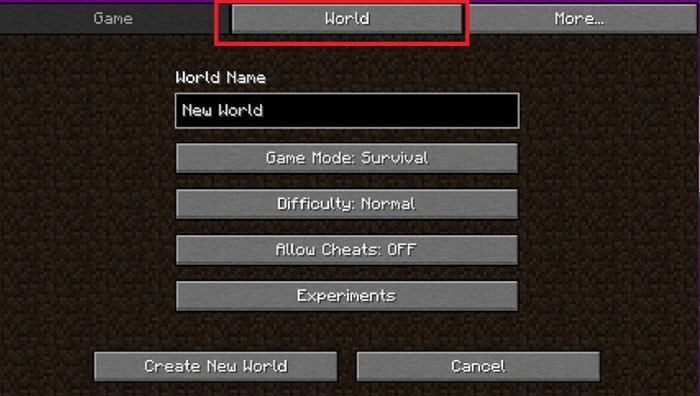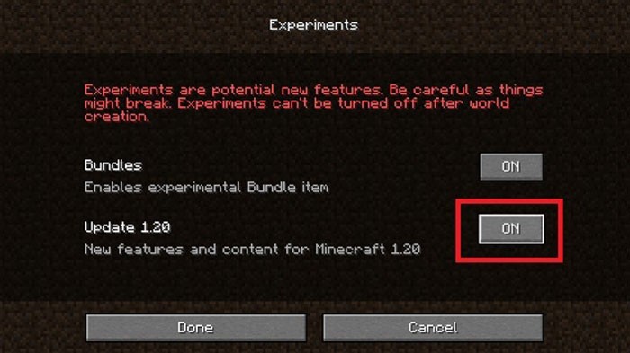 Bước 1: Truy cập vào mục Create New World và kích hoạt tùy chọn Update 1.20 trong phần cài đặt thử nghiệm.