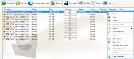 Thông tin tổng dung lượng file cần tải, dung lượng đã tải về và tốc độ tải hiện tại được hiển thị ở góc dưới bên phải giao diện chương trình. Để ưu tiên tải file nào, bạn nhấp chuột phải vào file đó, chọn Priority > chọn mức độ ưu tiên từ Very Low đến Very High. Khi quá trình tải hoàn tất, bạn nhấn nút Downloaded để truy cập thư mục chứa các file đã tải.