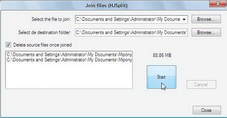 Đối với những file có dung lượng lớn được chia nhỏ bằng HJSplit, chương trình sẽ giúp bạn nối lại chúng bằng tiện ích Join Files được tích hợp sẵn. Bạn nhấn nút Join Files trên giao diện để mở cửa sổ làm việc, nhấn nút Browse bên cạnh dòng Select the file to joint để chọn file cần nối, sau đó nhấn nút Browse ở dòng Select de destination folder để chỉ định thư mục lưu file kết quả. Cuối cùng, nhấn Start để bắt đầu quá trình nối file.