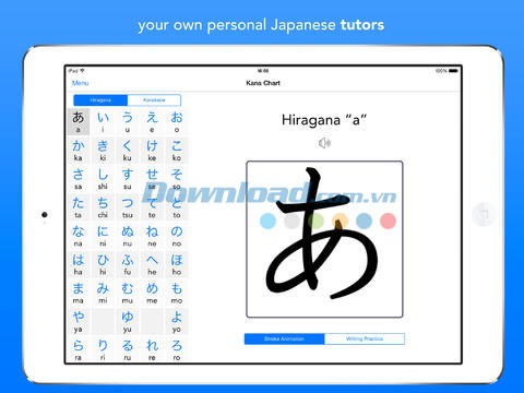 - Tính năng cho phép luyện tập viết chữ Kana trực tiếp trên màn hình thiết bị.