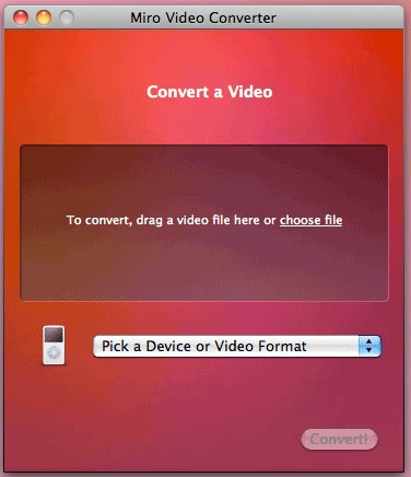 Việc sử dụng Miro Video Converter cực kỳ đơn giản. Bạn chỉ cần kéo và thả file video cần chuyển đổi vào khung To convert, drag a video file here … , hoặc nhấp vào liên kết Choosee a file để chọn file từ máy tính.