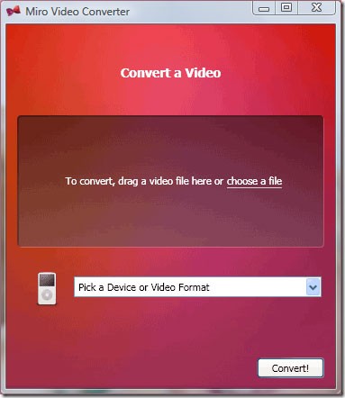Việc sử dụng Miro Video Converter vô cùng dễ dàng. Bạn chỉ cần kéo và thả file video cần chuyển đổi vào khung To convert, drag a video file here … , hoặc nhấp vào liên kết Choosee a file để chọn file từ máy tính.