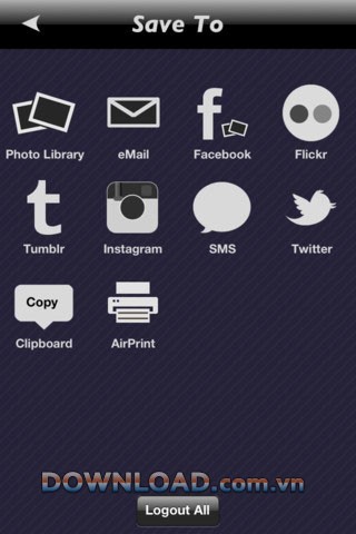 - Nguồn ảnh đa dạng: Ảnh có thể được tải từ Album ảnh, Camera hoặc Clipboard. Sau khi hoàn tất chỉnh sửa, ảnh sẽ được lưu vào Album, gửi qua Email, MMS, hoặc chia sẻ lên các nền tảng như Facebook, Instagram, Flickr, Tumblr và Twitter.