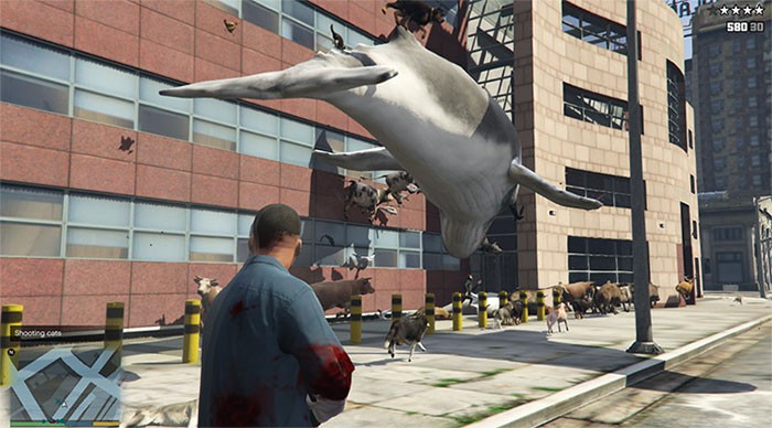 Người chơi có thể trải nghiệm những tình huống dở khóc dở cười, ví dụ như hạ gục trực thăng bằng một chú cá voi khổng lồ, chống lại lực lượng cảnh sát bằng những viên đạn được tạo thành từ mèo, hoặc thậm chí sử dụng chó để kéo dài thời gian trong các phi vụ cướp ngân hàng.
