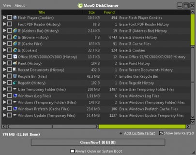 Moo0 DiskCleaner hỗ trợ tới hơn 130 loại mục tiêu khác nhau, bao gồm các tập tin tạm thời của hệ thống, dữ liệu cá nhân lưu trữ trong registry, bộ nhớ cache, lịch sử duyệt web và cookies của các trình duyệt phổ biến như IE, Firefox, Opera.