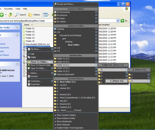 Phần mềm này bổ sung thêm nhiều chức năng hữu ích vào menu chuột phải, bao gồm việc lưu dấu trang (Bookmark), điều hướng nhanh đến các tệp tin hoặc thư mục, tạo phím tắt trực tiếp từ chuột phải, và mở các thư mục đã lưu trong dấu trang của Moo0 RightClicker.