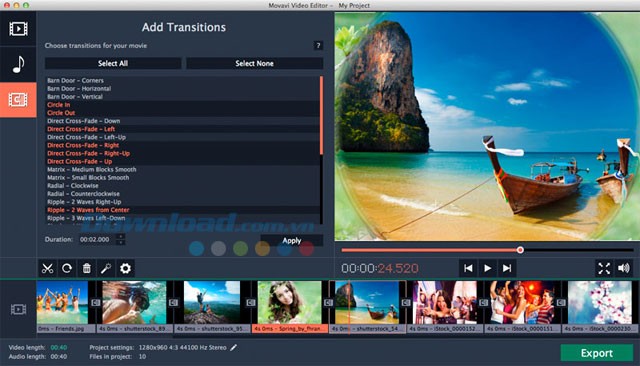 Bạn có thể nhấn nút Select All để áp dụng tất cả các hiệu ứng chuyển tiếp có sẵn, hoặc chọn một vài hiệu ứng cụ thể bằng cách sử dụng phím Cmd hoặc Shift kết hợp với chuột.