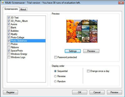 Hộp thoại cấu hình sẽ hiện ra, mặc định tab Screensaver được chọn. Tại đây, tất cả các Screensaver có sẵn trong hệ thống sẽ được chọn để trình chiếu luân phiên. Bạn có thể dễ dàng bỏ chọn những Screensaver không mong muốn bằng cách bỏ tích trước tên của chúng.