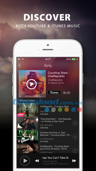 Khả năng tìm kiếm và thưởng thức nhạc một cách dễ dàng từ cả YouTube và cửa hàng iTunes, hoàn toàn miễn phí.