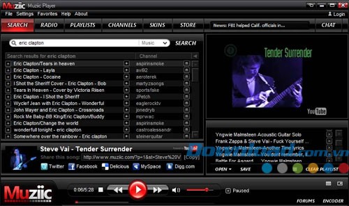 Muziic Player sở hữu giao diện thân thiện và dễ sử dụng, với thanh thực đơn và các thẻ chức năng chính như: search, radio, playlist, channels, skin và store.