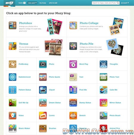 Muzy là một nền tảng blog sáng tạo trên Facebook, hoàn toàn miễn phí. Ứng dụng này cho phép người dùng tạo ra những bức ảnh cắt dán độc đáo, chỉnh sửa hình ảnh và chia sẻ những tác phẩm nghệ thuật của mình.