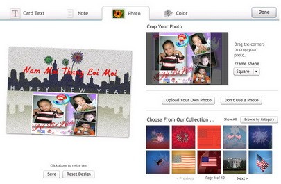 Tab Photo cho phép bạn chọn ảnh có liên quan đến ngày Tết từ thư viện của trang web hoặc chọn ảnh từ máy tính của mình để làm điểm nhấn trên tấm thiệp.