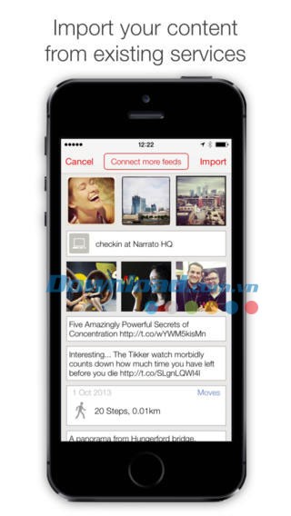 Tính năng Narrato LifeStream cho phép tổng hợp các hoạt động từ nhiều dịch vụ khác nhau mà bạn thường xuyên sử dụng, bao gồm các mạng xã hội phổ biến như Facebook , Twitter , Instagram , Foursquare , Moves và App.net.