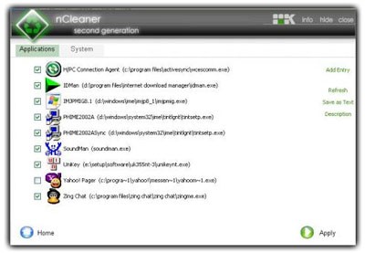 Thẻ Startup Man hiển thị danh sách các chương trình tự động chạy cùng hệ thống. Đây cũng là một trong những nguyên nhân gây chậm trễ khi khởi động máy tính. Mặc định, các chương trình đang chạy sẽ được đánh dấu bằng dấu tích hình chữ "v". Bạn có thể bỏ chọn những chương trình không cần thiết và nhấn Apply để nCleaner tự động loại bỏ chúng. Ngoài ra, bạn cũng có thể thêm các chương trình muốn chạy cùng hệ thống bằng cách nhấp chọn Add entry.
