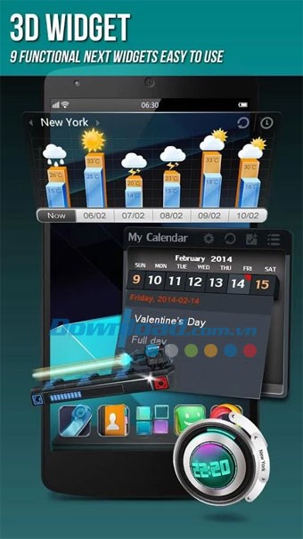 Ứng dụng tương thích với các widget 3D độc quyền của Next, các theme 3D đa dạng và hình nền động được phát triển bởi đội ngũ GO Launcher Dev Team.