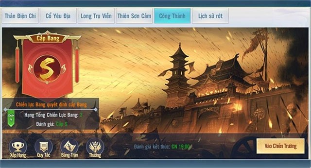 - 12 Bang hội xuất sắc nhất tham gia Công Thành Chiến sẽ được phân chia vào 4 cấp chiến trường: S, A, B, C. Các Bang hội sẽ tranh tài để tìm ra top 3 của mỗi cấp.