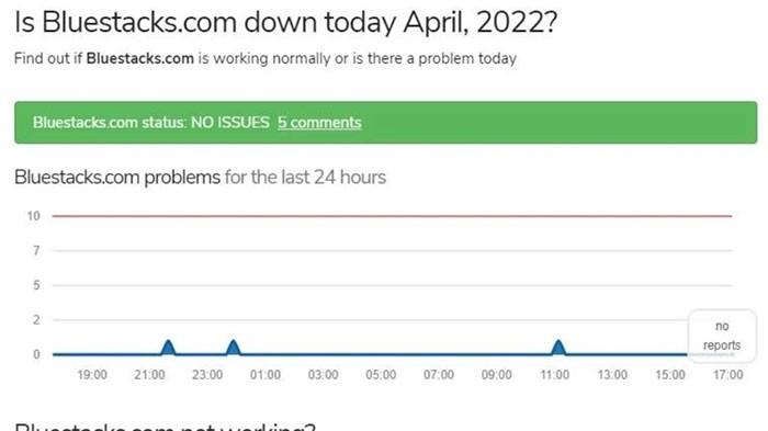Bước đầu tiên mà người dùng nên thực hiện khi BlueStacks gặp sự cố là kiểm tra xem trình giả lập có đang tồn tại lỗi nào không. Hãy truy cập trang web chính thức của updownradar để theo dõi tình trạng hoạt động của ứng dụng và các báo cáo lỗi gần đây.