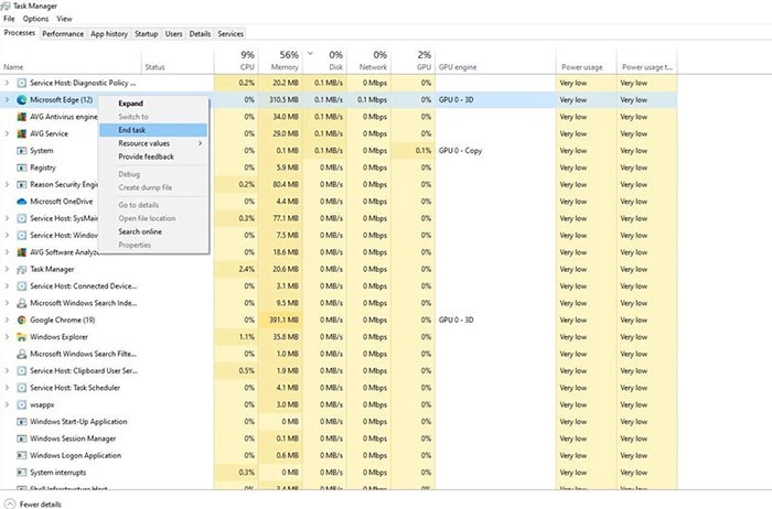 Việc chấm dứt một tiến trình có thể được thực hiện bằng cách nhấp chuột phải vào tiến trình đó và chọn End task.