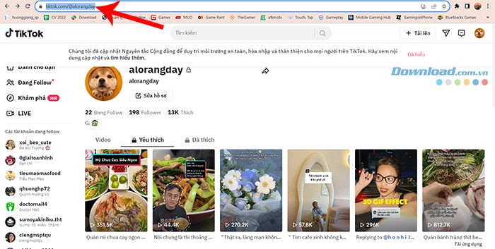 Bước 3: Sao chép URL (địa chỉ liên kết) từ thanh địa chỉ của trình duyệt, đây chính là liên kết đến trang hồ sơ TikTok của bạn.