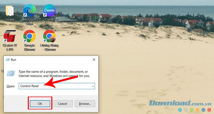 Bước 2: Nhập cụm từ Control Panel vào ô nhập liệu của hộp thoại Run, sau đó nhấn OK. Hoặc, bạn có thể nhập đơn giản Control và nhấn OK để mở Control Panel.