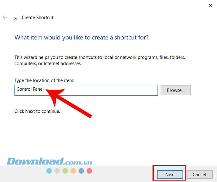 Bước 2: Trong cửa sổ tạo phím tắt, nhập đường dẫn của ứng dụng bạn muốn tạo phím tắt vào ô vị trí. Sau đó, nhấn vào nút Next để tiếp tục.