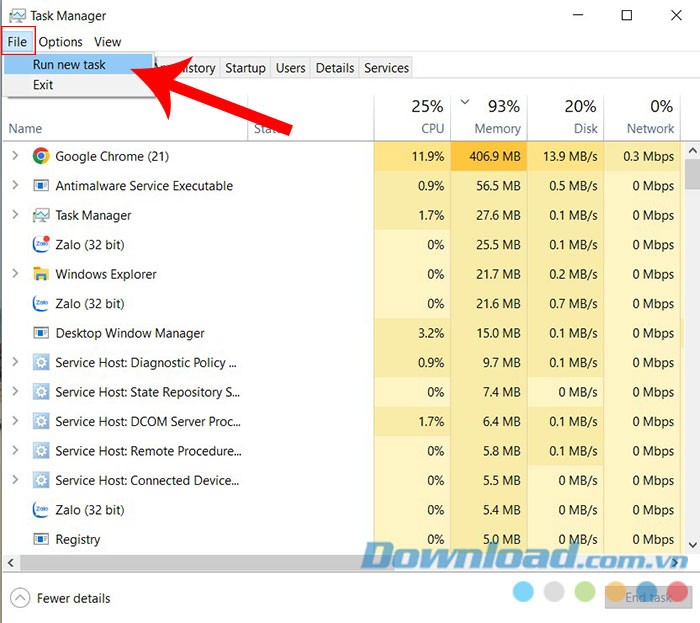 Bước 2: Trong cửa sổ Task Manager, chọn File, sau đó chọn Run new task ở góc trên cùng bên trái.