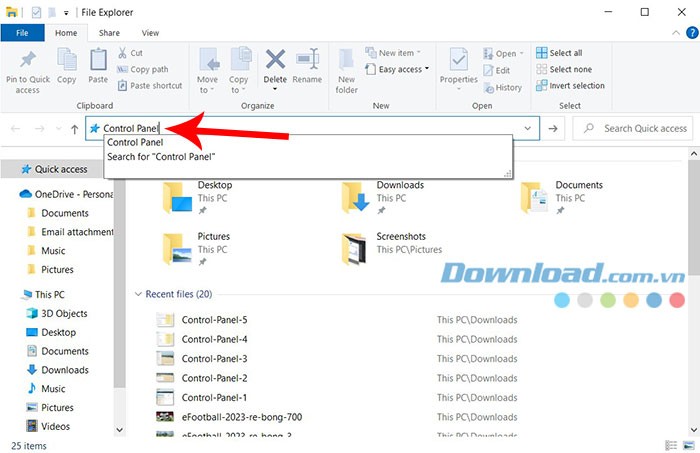 Bước 2: Sau khi cửa sổ File Explorer mở ra, hãy nhập từ khóa Control Panel vào ô tìm kiếm ở góc trên bên phải và nhấn phím Enter để thực hiện.