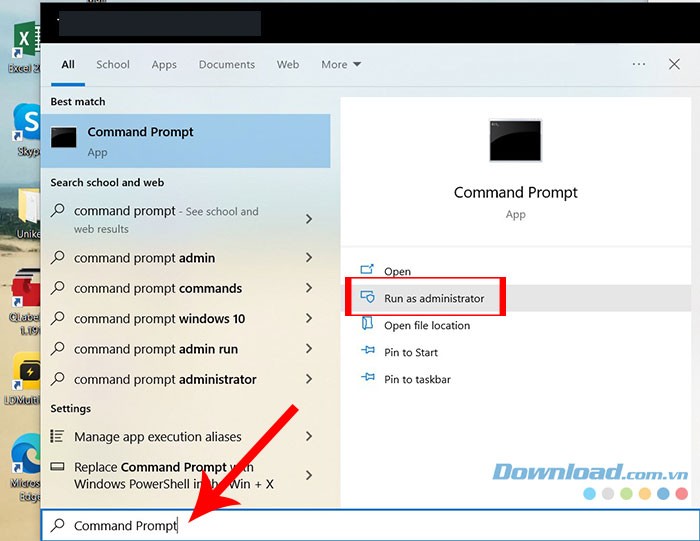 Bước 1: Click vào biểu tượng Windows để hiển thị menu Start. Sau đó, nhập lệnh và chọn Run as administrator từ danh sách kết quả hiển thị ở phía bên phải màn hình.